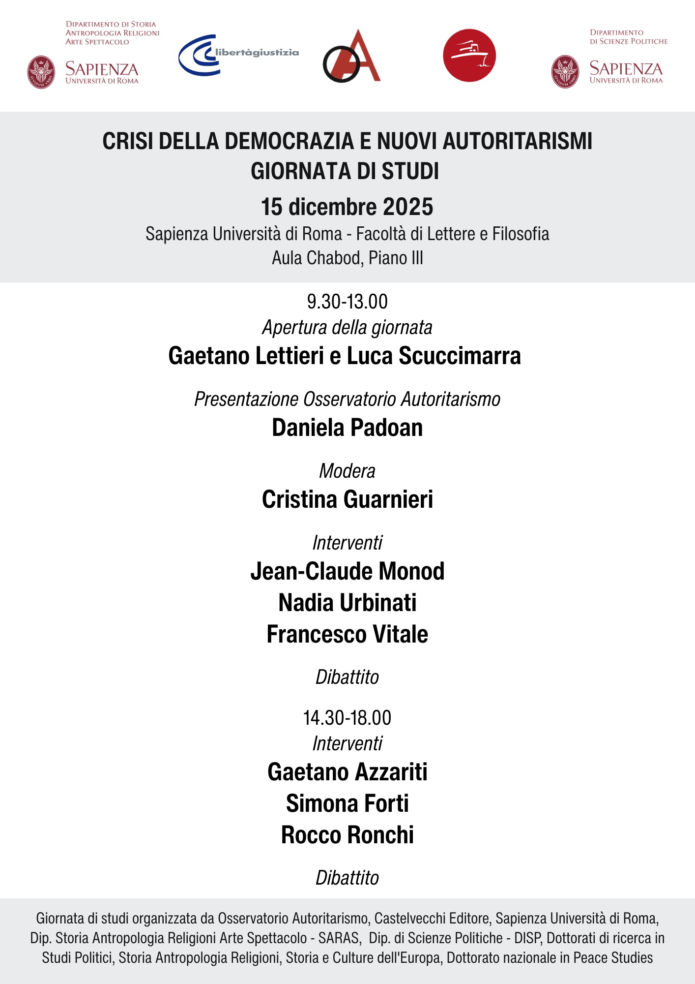 Una giornata di studio dell’Osservatorio Autoritarismo, promossa da Libertà e Giustizia, Castelvecchi editore, il Dipartimento di Scienze politiche e il Dipartimento di Storia dell’Università Sapienza di Roma.