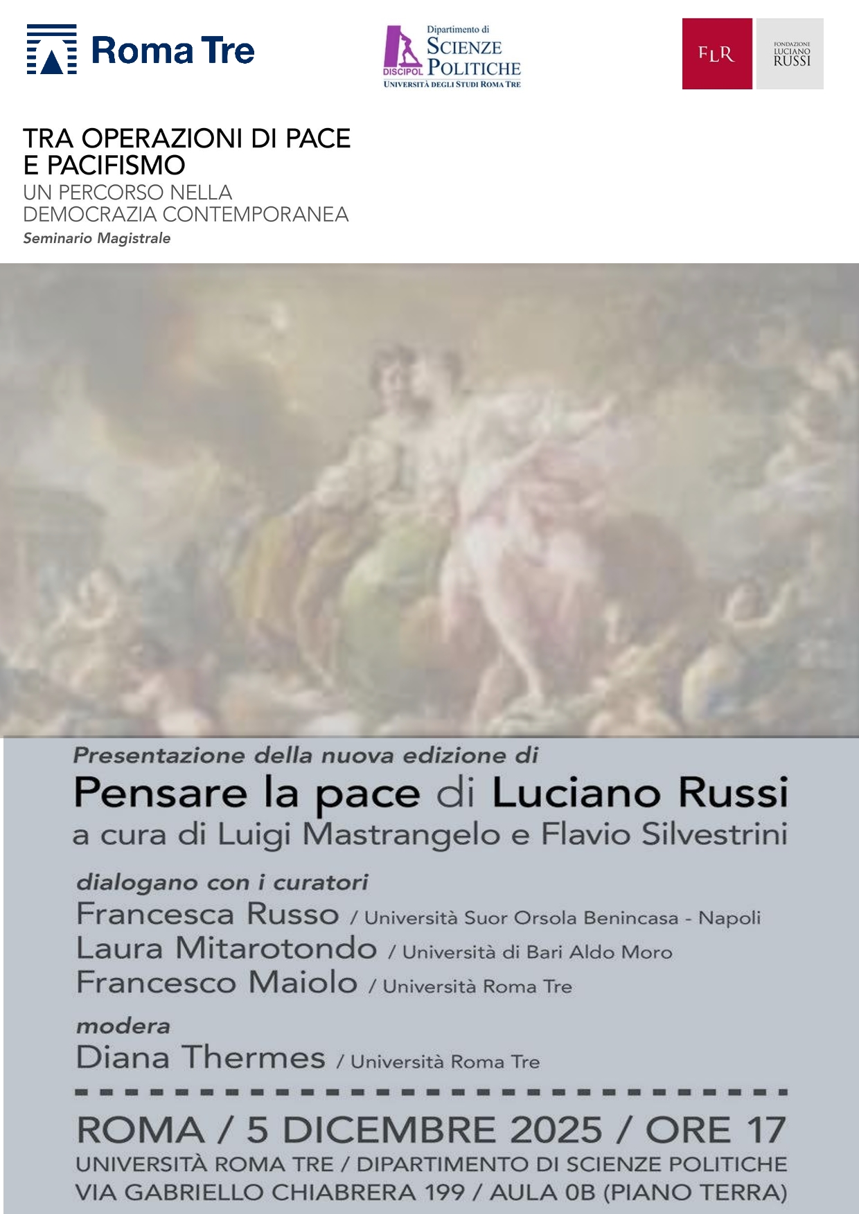 All’interno del seminario multidisciplinare, Tra operazioni di pace e pacifismo: un percorso nella democrazia contemporanea, previsto annualmente per i corsi magistrali del Dipartimento di Scienze Politiche di Roma Tre, verrà presentato il prossimo venerdì 5 dicembre, la nuova edizione del libro di Luciano Russi, Pensare la pace (Di Felice Edizioni, 2024)) a cura di Lugi Mastrangelo e Flavio Silvestrini. Dialogheranno con i curatori studiosi che, con diversi approcci, rifletteranno sul tema della pace, anche in relazione alle questioni della democrazia contemporanea: Francesca Russo, dell’Università Suor Orsola Benincasa – Napoli, Laura Mitarotondo, dell’Università di Bari Aldo Moro e Francesco Maiolo, dell’Università Roma Tre. Modererà l’incontro Diana Thermes, dell’Università Roma Tre.