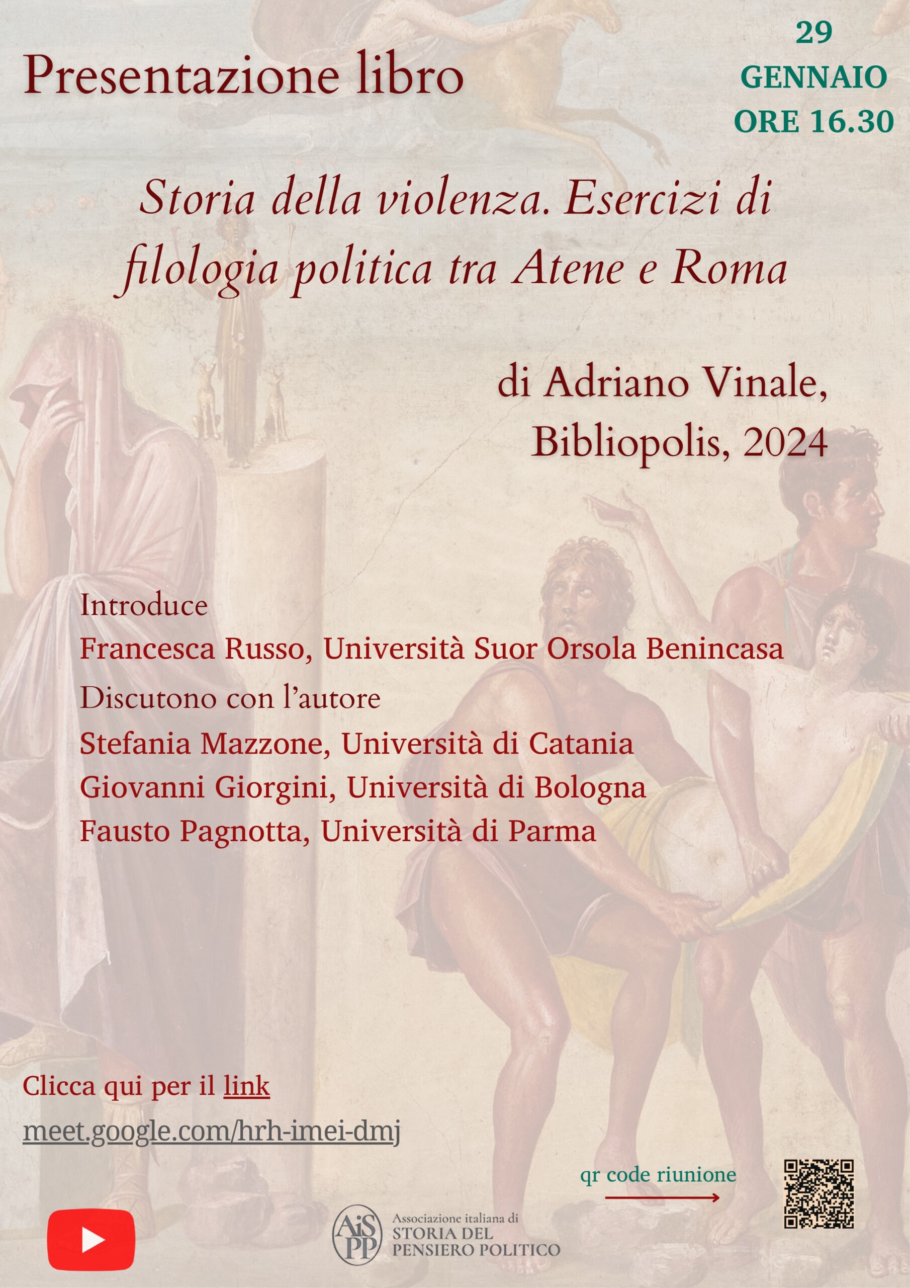 A partire dal gennaio 2023, l’AISPP organizza, con cadenza mensile, la presentazione online di libri che affrontano, dalle più diverse prospettive, i grandi temi della storia del pensiero politico. Le presentazioni vengono registrate e poi pubblicate sul canale YouTube dell’Associazione.