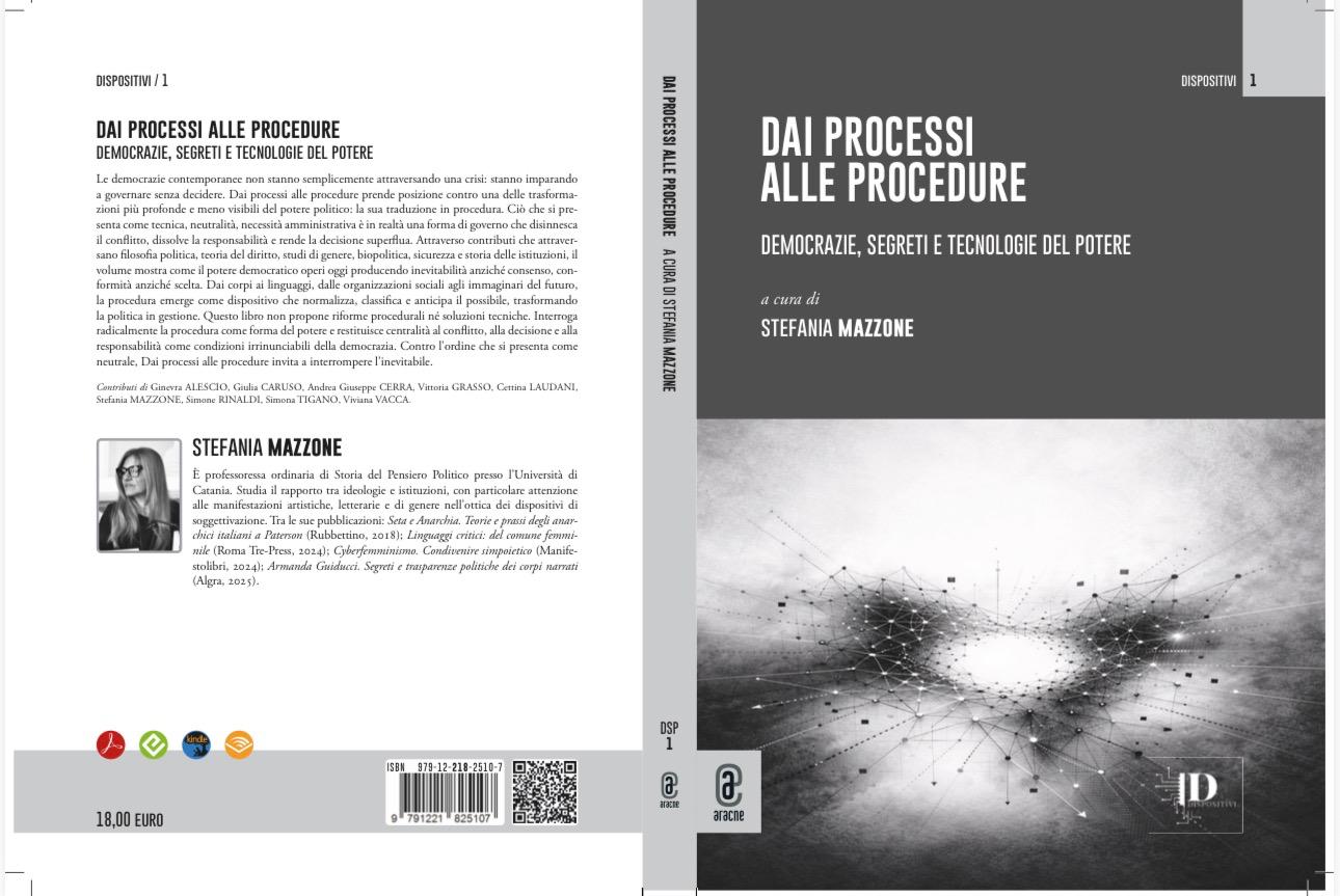 di Stefania Mazzone Aracne , 2026 - A cura di Stefania Mazzone, con i contributi di Cettina Laudani, Simona Tigano, Simone Rinaldi, Giulia Caruso, Ginevra Alescio, Viviana Vacca, Vittoria Grasso, Andrea Giuseppe Cerra, attraverso un dialogo interdisciplinare che intreccia storia politica, diritto dell’Unione europea, studi sul linguaggio e sul genere, disability studies, antipsichiatria, teoria critica del diritto penale, cyberfemminismo, studi sugli immaginari distopici e analisi dell’associazionismo politico, il volume mostra come la procedura governi corpi, differenze, devianze, tecnologie e forme della partecipazione democratica. Per comprendere come il potere, presentandosi come impersonale e inevitabile, possa essere riconosciuto, contestato e ri-politicizzato, questo libro restituisce centralità al conflitto. Contro l’ordine che si presenta come neutrale, "Dai processi alle procedure" invita a interrompere l’inevitabile.